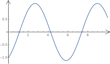 Plot[1/2*Sin[x] - Cos[x], {x, 0, 10}, PlotStyle -> Thick, AxesStyle -> Arrowheads[{{Automatic, Automatic, h}}]] |