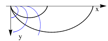 Arrow[{{0, 0}, #}] & /@ {{x, 0}, {0, y}}, {Text[ Style["x", FontSize -> Scaled[f]], {0.9*x, .08*y}], Text[Style["y", FontSize -> Scaled[f]], {0.1 x, 1*y}]}]] data1 = Table[{t, cycloid[1, 1][t][[1]], cycloid[1, 1][t][[2]]}, {t, 0, 2 \[Pi], 0.01}]; Show[ListLinePlot[{#2, -#3} & @@@ data1, PlotRange -> {{-\[Pi]/4, 3 \[Pi]}, {-3, 0}}, AspectRatio -> Automatic, Ticks -> {None, None}, Frame -> False, PlotRange -> All, PlotRangeClipping -> False, ImagePadding -> {{20, 20}, {20, 20}}], axes[9.7, -3.2, .07, .07], Graphics[{{Dashed, Circle[{0, -1}, 1]}, Point[{\[Pi] + .5, -1}], Point[{4.123, -1.9}], Circle[{\[Pi] + .5, -1}, 1], Line[{{0, 0}, {0, -1}}], Point[{0, 0}], Point[{\[Pi]*2, -1}], Point[{\[Pi]*2, 0}], Point[{0, -1}], {Dashed, Circle[{\[Pi]*2, -1}, 1]}, Line[{{\[Pi]*2, 0}, {\[Pi]*2, -1}}], Line[{{\[Pi] + .5, -1}, {4.123, -1.9}}]}] |