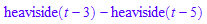 We can also shift the Heaviside function along the X axis. By applying a condition within the parenthesis of the H(t) function, we can accomplish this, creating a shifted Heaviside function. For example $H(t-3)$ would slide the function to the right 3 units. We can also use 2 Heaviside functions to create an interval where the function is the value 1, and zero outside this interval. The way to do this is to create the difference of two shifted Heaviside functions. The following MuPAD code will illustrate these properties: