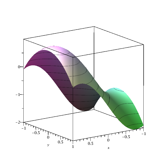 plot3d(sin(2*x)-y^2,x=-1..1,y=-1..1,axes=boxed,grid=[64,64],style=patchcontour);