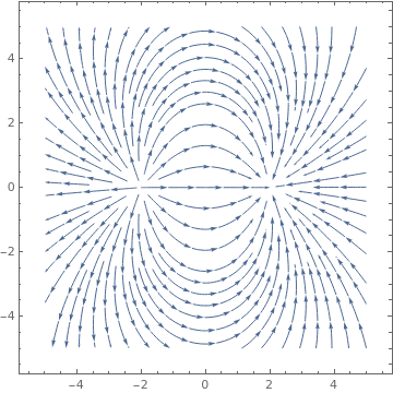 projector[{x_, y_, z_}] := {x, y} VectorPlot[ projector[ charge[1, {0, 4, 0}][x, y, 0] + charge[-1, {0, -4, 0}][x, y, 0]], {x, -10, 10}, {y, -10, 10}]; StreamPlot[ projector[ charge[1, {-2, 0, 0}][x, y, 0] + charge[-1, {2, 0, 0}][x, y, 0]], {x, -5, 5}, {y, -5, 5}] |