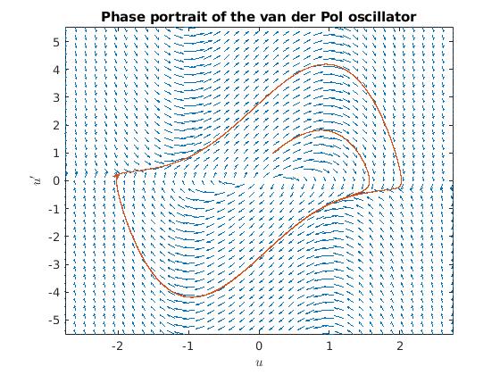 Once we have called quiver, we overlay the phase plane portraits of solutions obtained by specifying different initial conditions -- notice how the solutions follow the arrows of the quiver plot, then get attracted to the same limit cycle (regardless of whether we start inside or outside of the cycle).